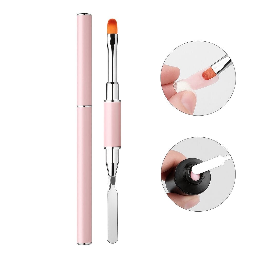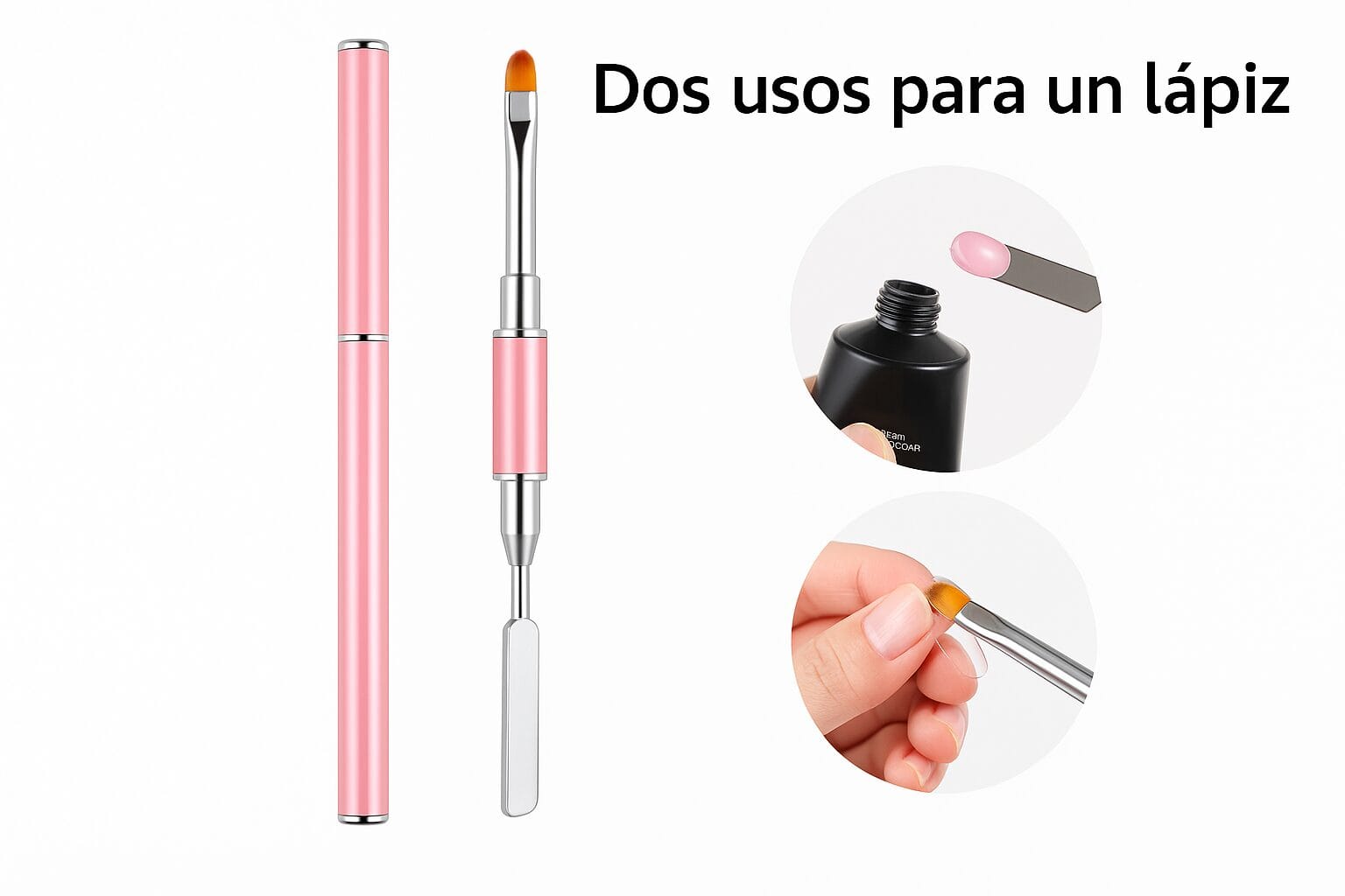 Un extremo tiene un pincel de cerdas sintéticas para moldear el polygel, y el otro extremo tiene una espátula metálica para tomar el producto del frasco o tubo. - Color rosa elegante:
